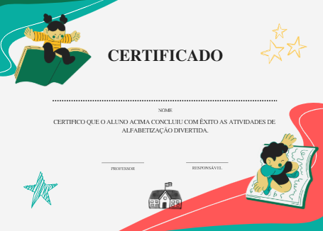 Ao finalizar as atividades, você presenteia a criança com um certificado exclusivo que reconhece todo o seu esforço e dedicação. Mais do que um documento, é uma lembrança especial que valoriza cada conquista e motiva os pequenos a seguirem aprendendo com alegria. Com este certificado, o aprendizado se transforma em orgulho e celebração — um incentivo para que cada etapa seja vivida como uma vitória!